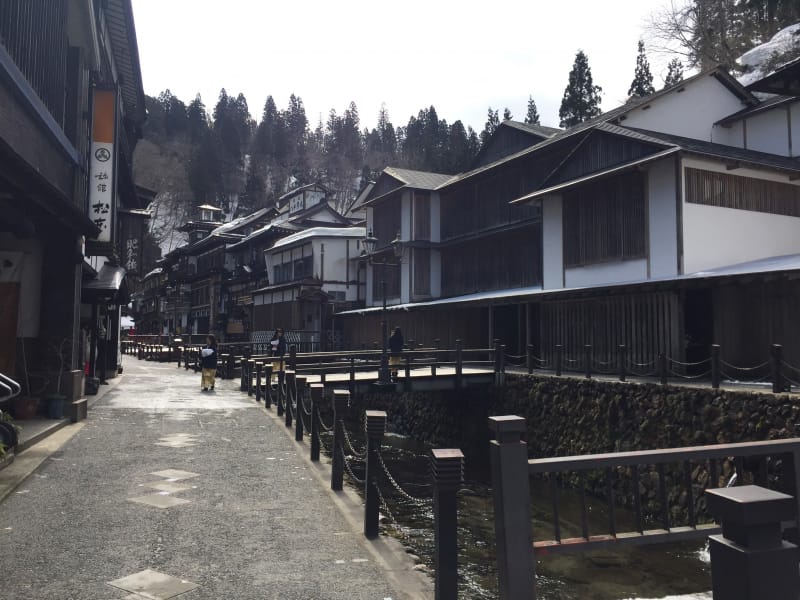 銀山温泉は、盆地にある季節によって気温差が激しい土地。夏は暑く、冬は豪雪地帯となるほどで、3月末でも雪が残り軒下にはつららもあるぐらいです。